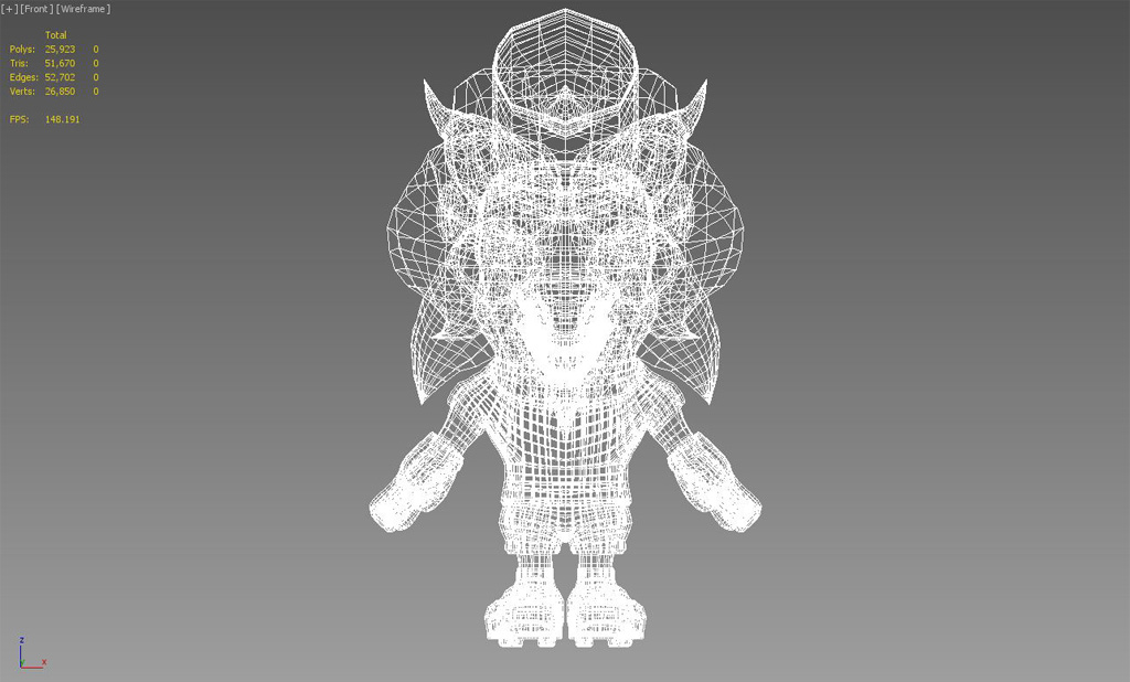 Texture size is 1024 x 1024 and triangle count is 51,670. This version is high poly and will be rendered out for promotional artwork. A different, low poly version will be used in-game.